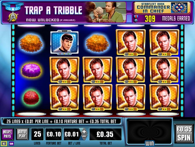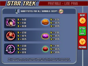 All WMS Star Trek slots come with 25 paylines, and this one is no exception. The features consist of scatters, wilds, the Win Warp and the bonus game called Tribble Pinball. You can win a prize of $5,000 with a bit of luck.