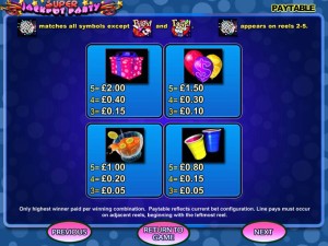 When this bonus feature triggers, you are asked to choose one of the party favors that are shown, in order to locate the party saver. Find it, and you get another round at choosing presents. If you don’t locate it, the Party feature ends.