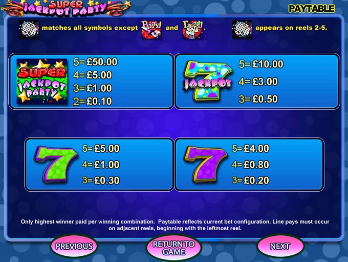 Symbols: Disco Ball (wild), Party Guy (scatter), Party Noise Maker (scatter), Game Logo (5,000 coins), Jackpot 7 (1,000 coins), Green 7 (500 coins), Purple 7 (400 coins), Present (200 coins), Balloons (150 coins), Punch Bowl (100 coins) and Cups (80 coins).