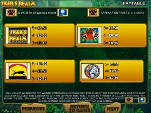 The Paw Print wild is present on the last four reels of Tiger’s Realm. The 2nd, 3rd, 4th and 5th reels are the ones that can host it, and it will substitute for other symbols when this happens, but it will not be capable of offering prizes directly since it doesn’t appear on the 1st reel and you can’t get enough of its symbols to form a wild combo.