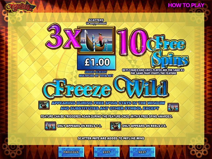 You will discover on the 5 reels of Venetian Romance that up to 50 lines can form their combinations. Rewards go up to $1,000 only, but besides the many chances to win you will also get the scatters, the wilds and the free spins with their frozen wilds.